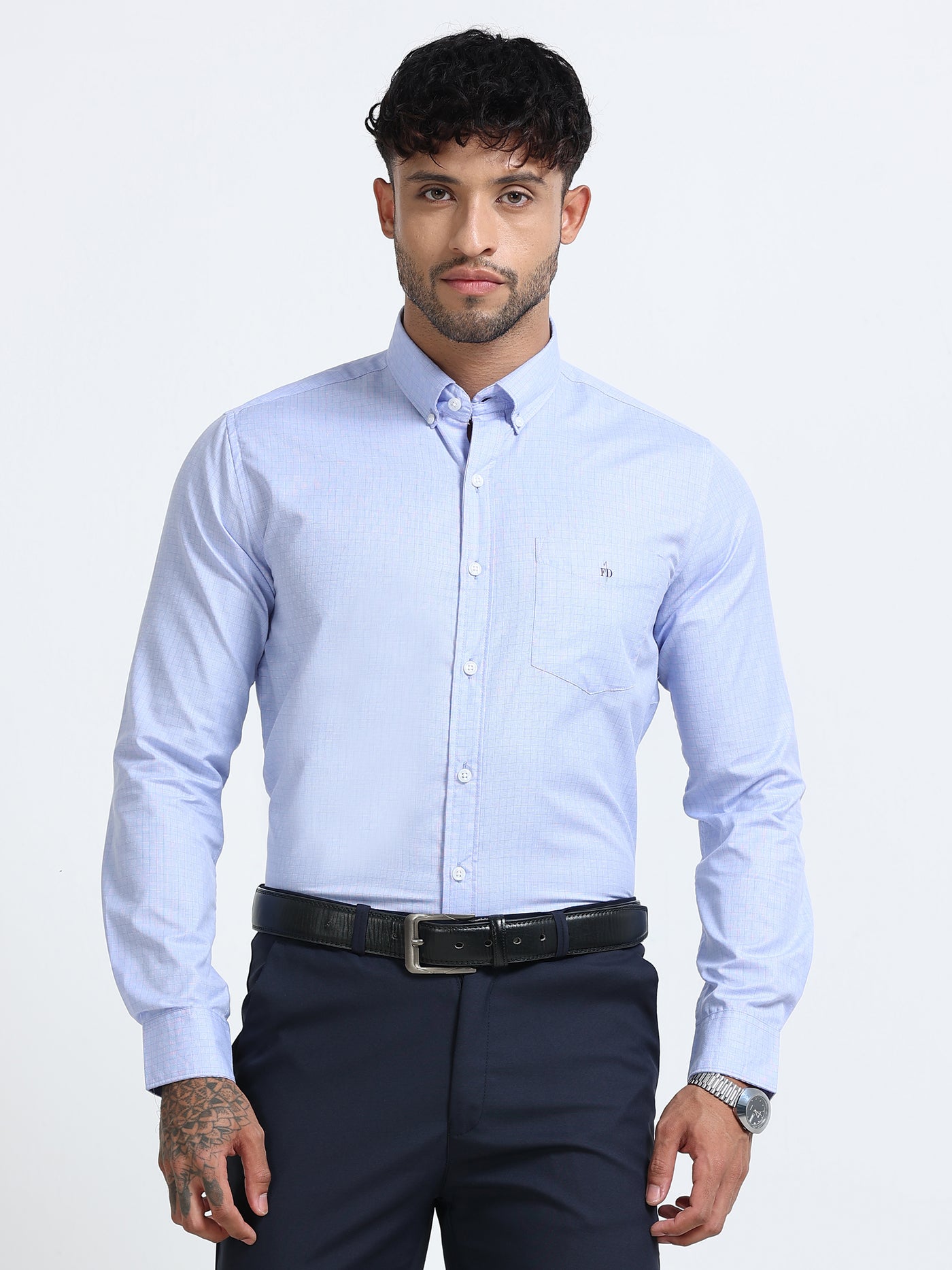 Elegant and formal, this ice blue micro-check shirt features a single pocket and subtle stripes, perfect for professional settings.