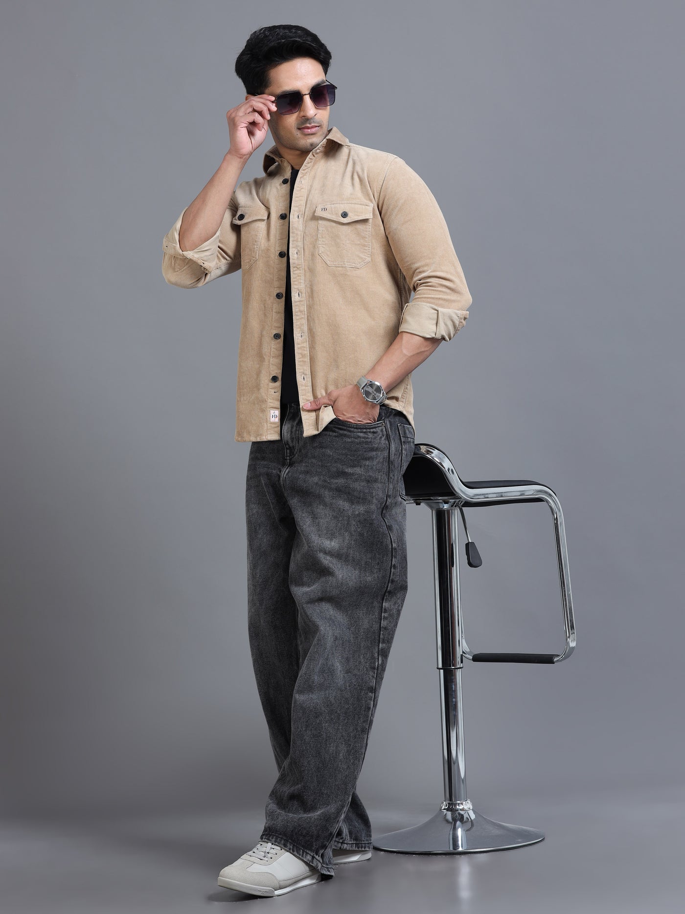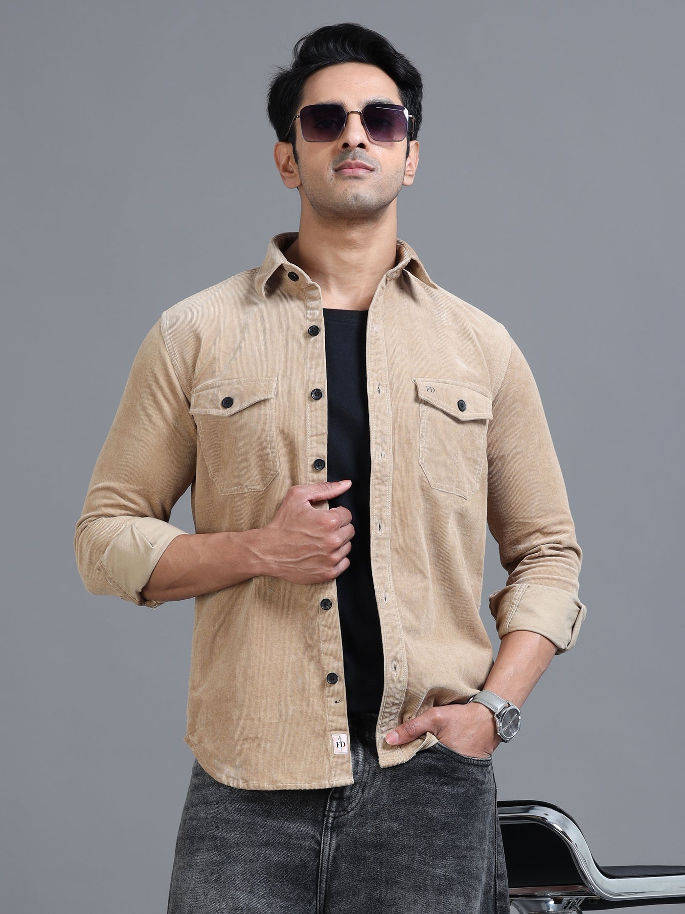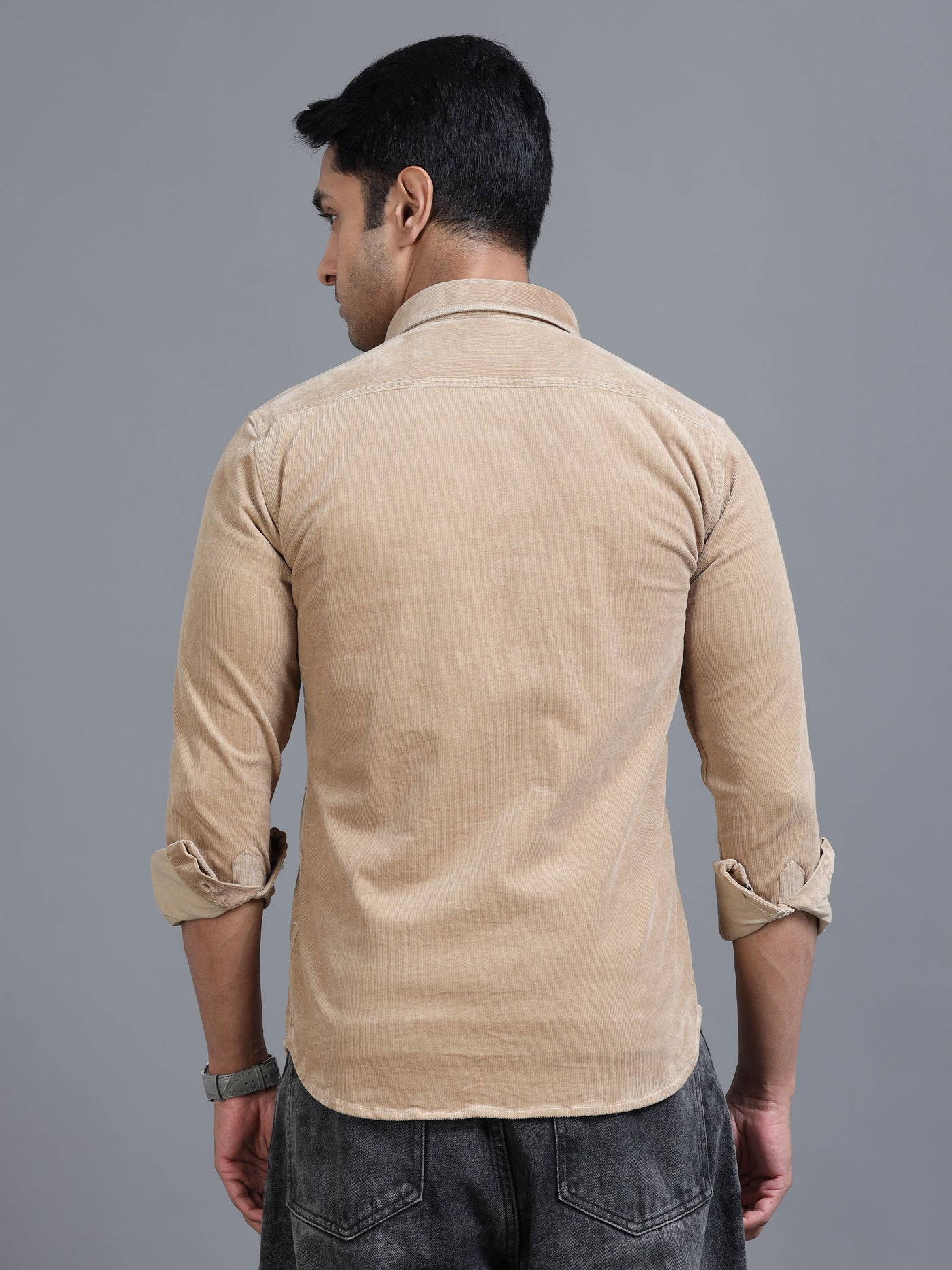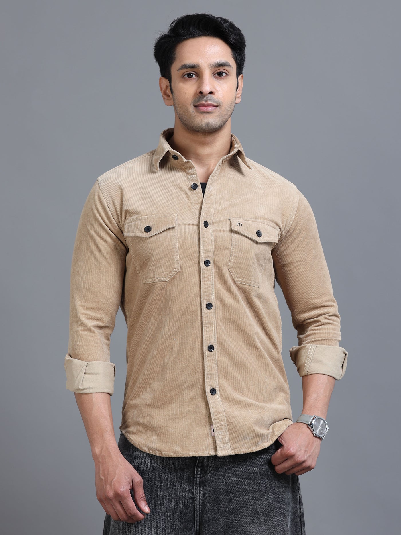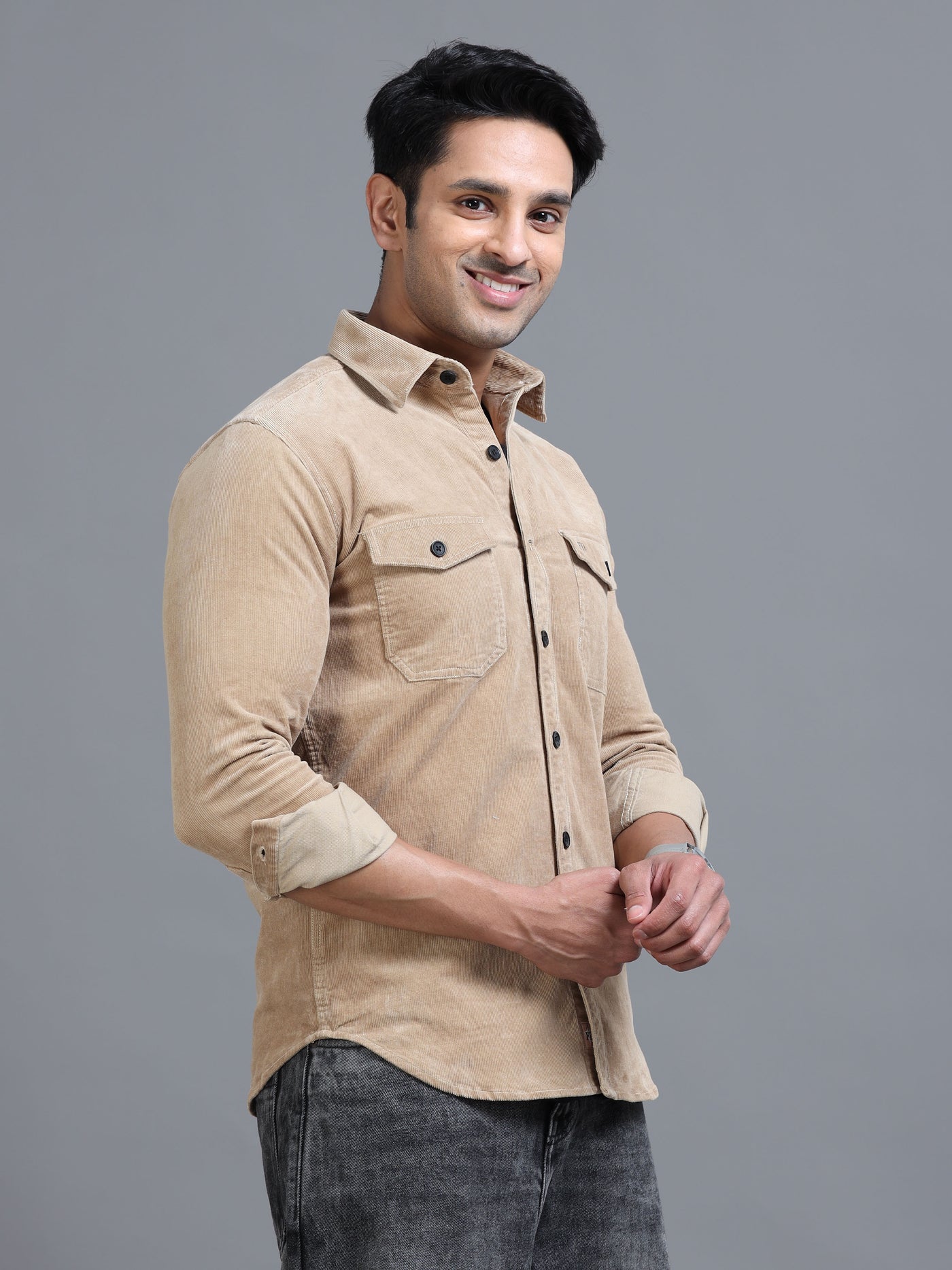 Classic beige utility shirt with dual flap pockets and contrast buttons. Timeless casual style with roll-up sleeves for effortless everyday wear.