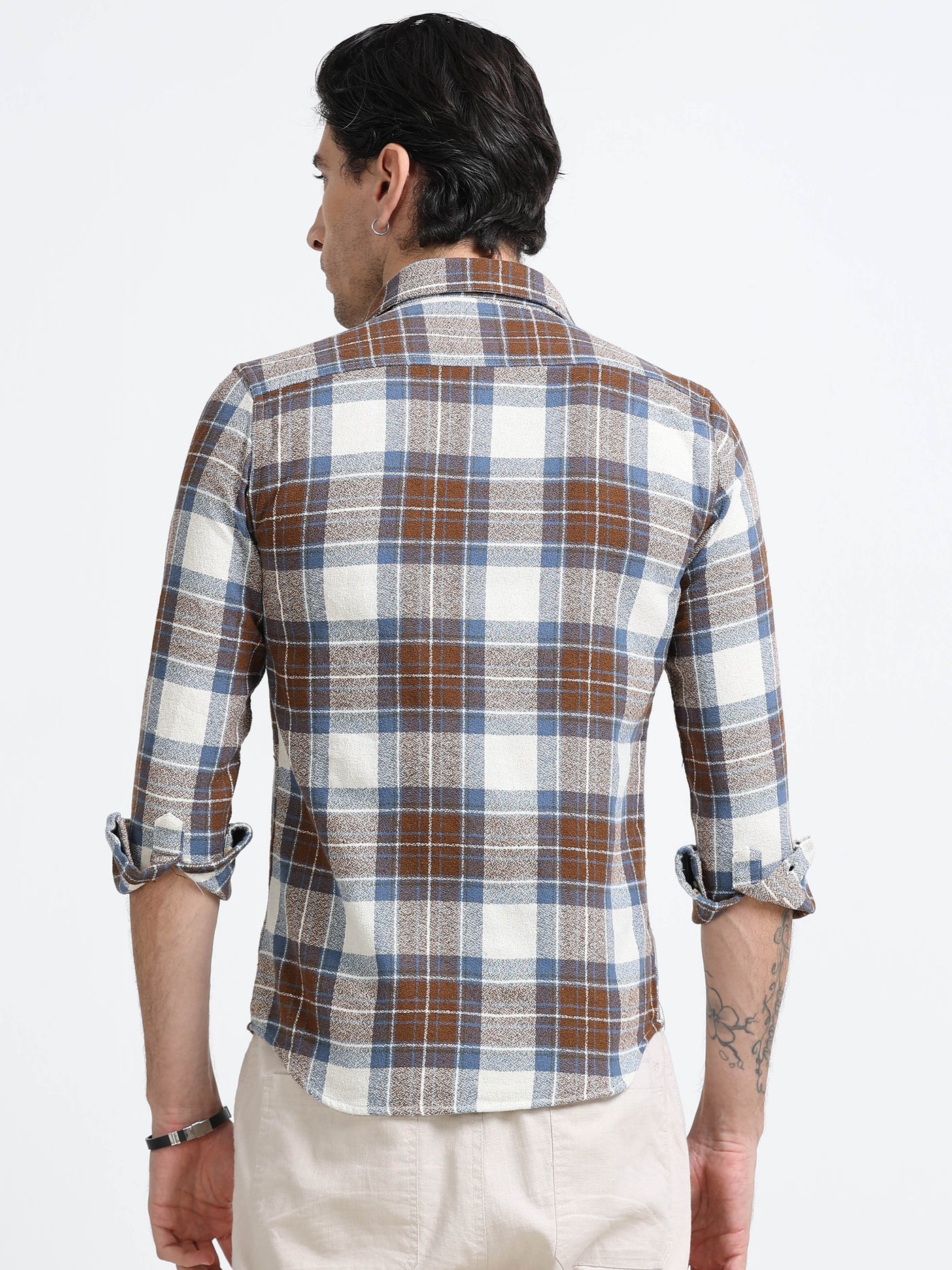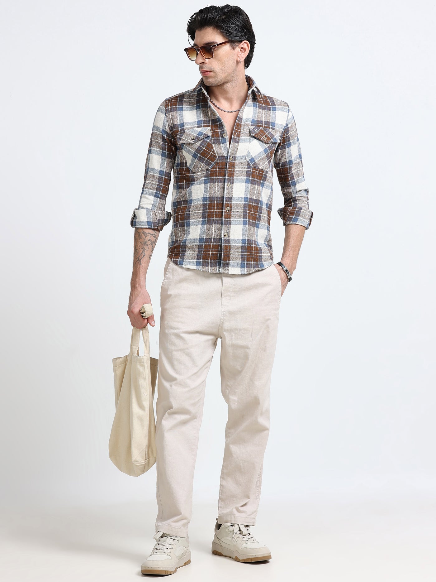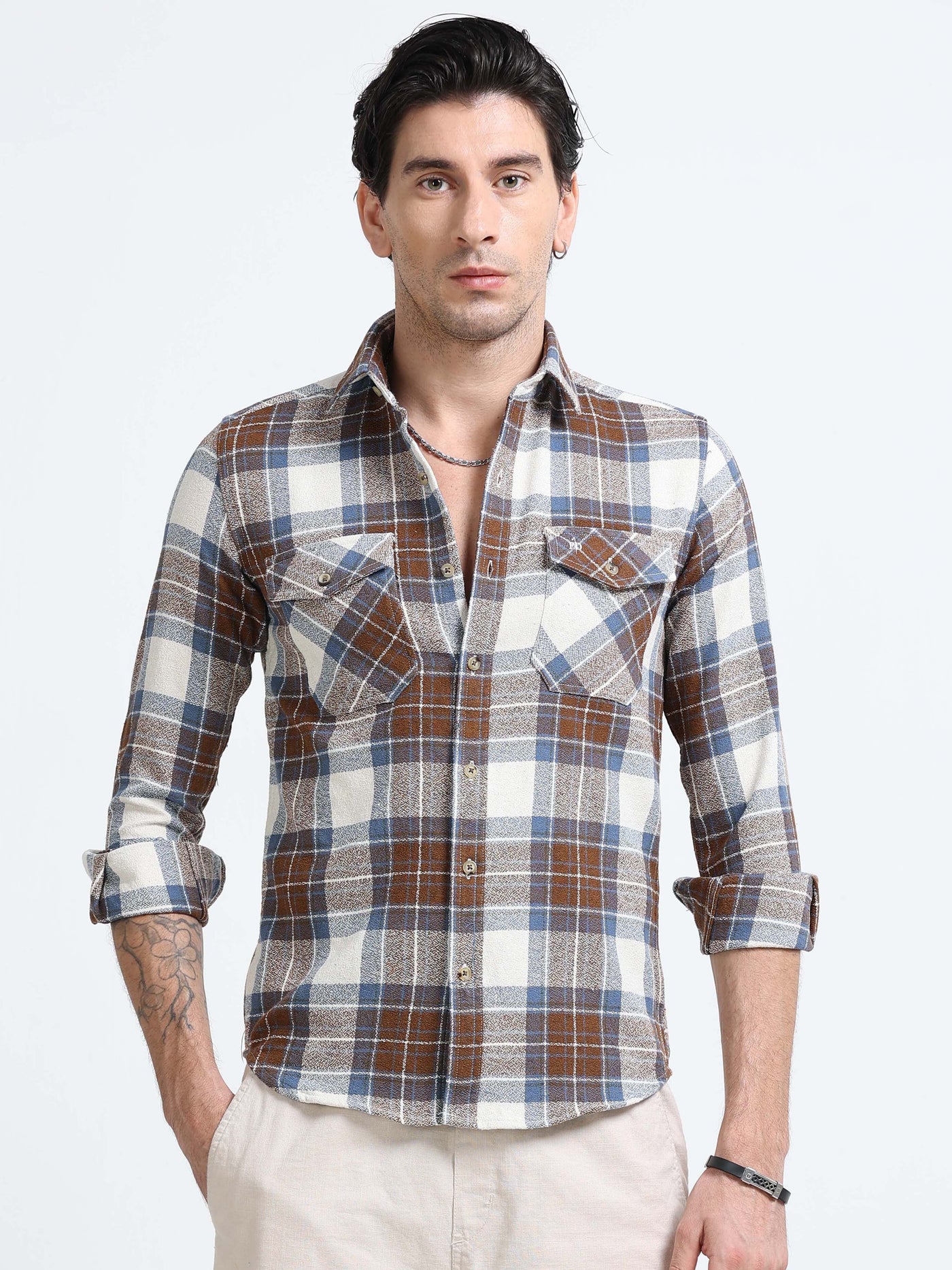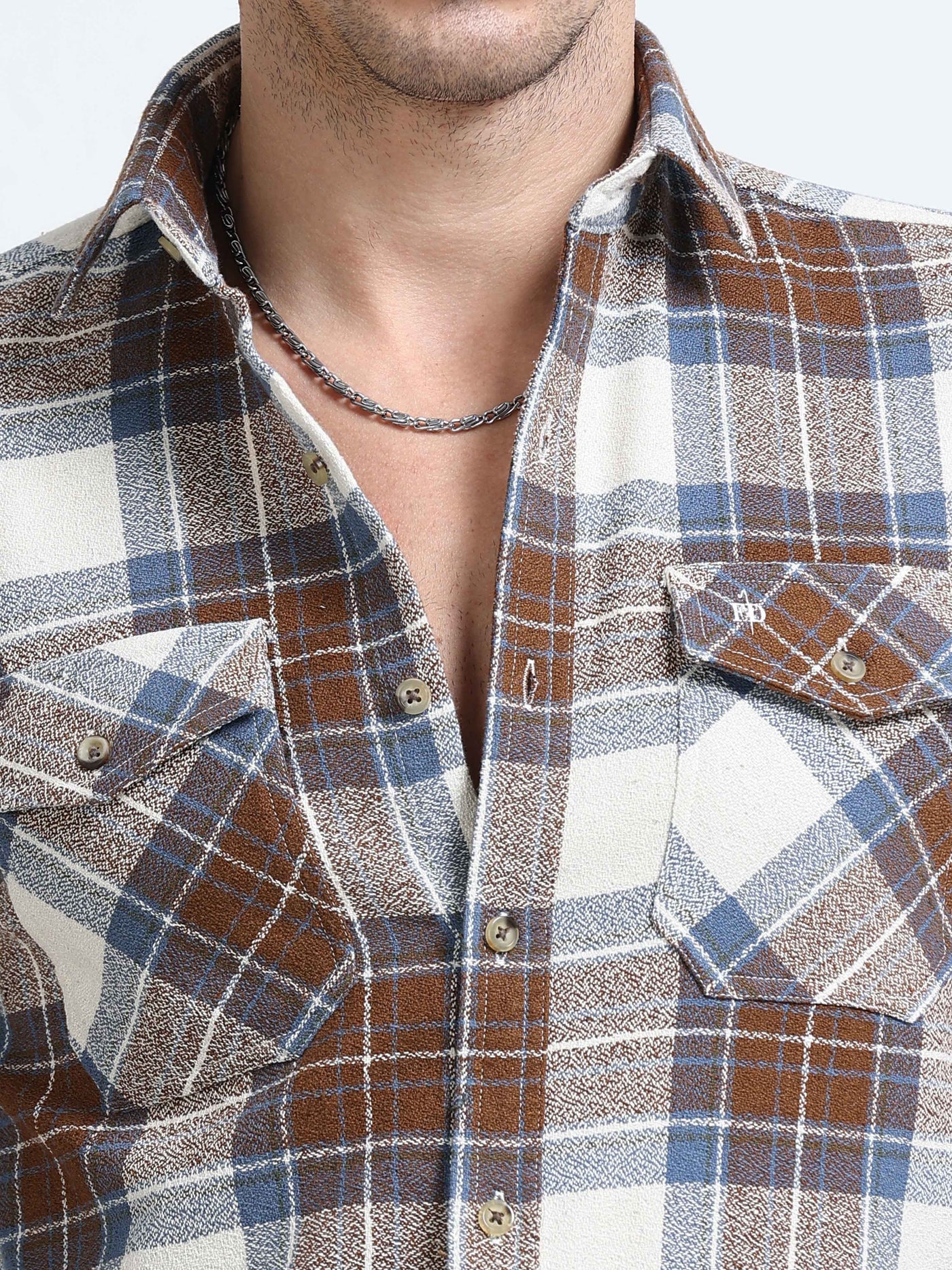 Trailblazer features a checked pattern, double pockets, brushed cotton fabric, perfect for party wear, blending style with comfort effortlessly.